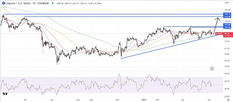 С ноября LTC находится в процессе формирования модели бычьего восходящего треугольника с поддержкой в виде восходящего тренда от минимумов ниже $50 и с сопротивлением в виде первых годовых максимумов в районе $103-105.