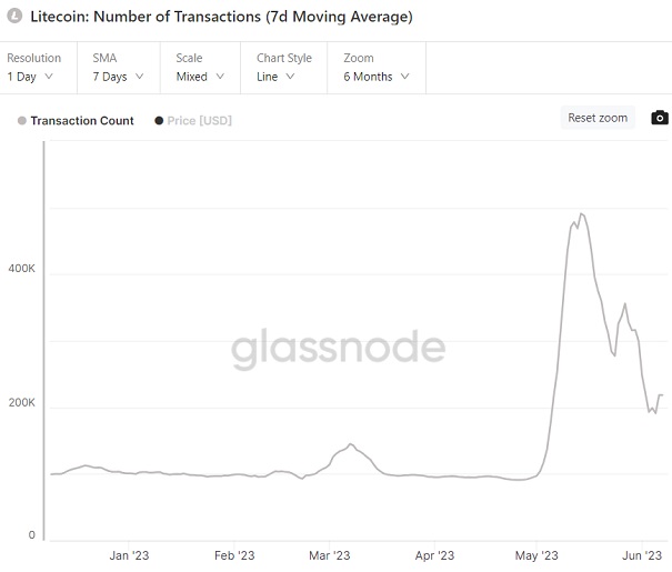 Согласно данным, представленным Glassnode, 7-дневная скользящая средняя ежедневных транзакций Litecoin достигла рекордного максимума почти в 500 000 14 мая, а затем упала до примерно 220 000 по состоянию на среду, что все еще удваивает уровень начала 2023 года.