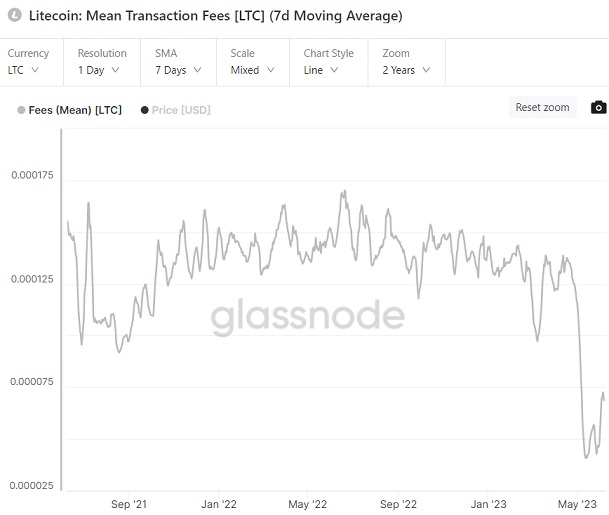 Однако вместо того, чтобы увеличиться, цены транзакций существенно упали. Согласно данным Glassnode, комиссии уменьшились с 0,00013 LTC в середине апреля до рекордно низкого уровня в 0,00004 LTC к середине мая и не сильно поднялись с этих уровней.