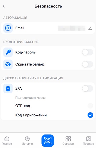- Двухфакторная аутентификация. Если включить ее, для подтверждения всех операций потребуется дополнительный одноразовый код из Google Authenticator или Authy.