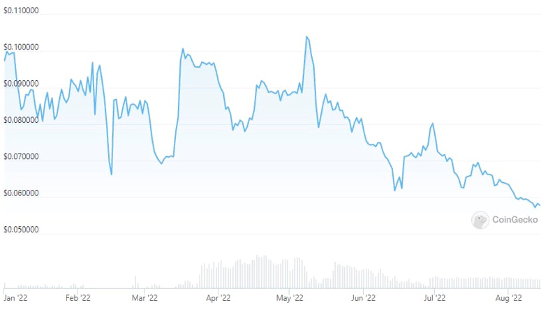 После достижения максимума в феврале 2021 года криптовалюта BDX подошла близко в экстремуму в октябре. В 2022 году на фоне общего снижения рынка монета подешевела с $0,099 в январе до $0,057 в августе. За это время котировки упали на 42% (с $0,141 до $0,0575).