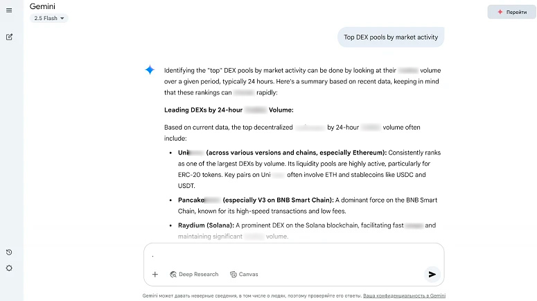 К сожалению, у Gemini меньше доступа к Web3-данным, поэтому ответы он выдает чуть менее проработанные, чем ASCN, но более глубокие, чем остальные участники списка. Именно поэтому он поставлен на второе место.