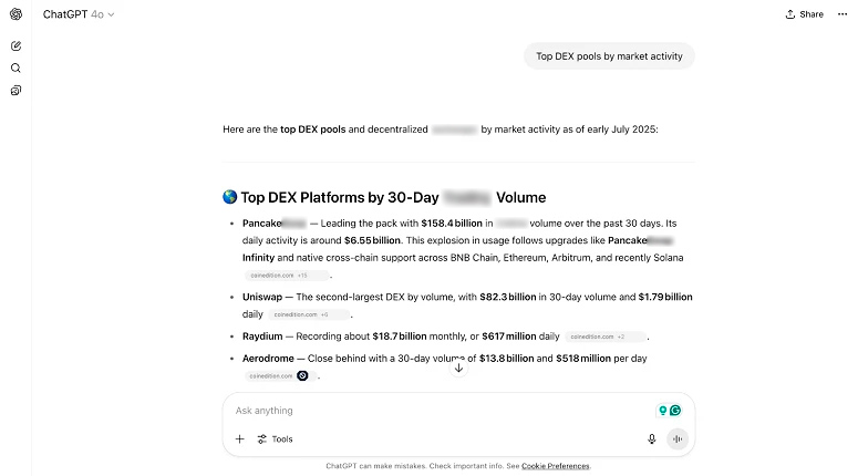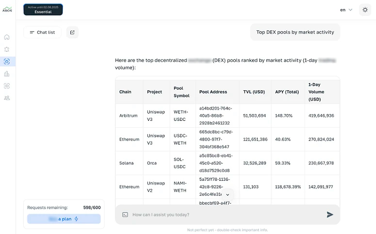 - Источники данных. Важно, откуда АИ-ассистент берет данные: они берутся напрямую из нод, CEX API, платных баз CoinMetrics, Glassnode или АИ-помощник работает по принципу классического поисковика.