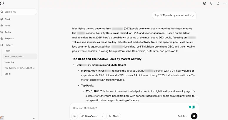 Grok на данный момент является лучшим AI-ассистентом для поиска и анализа тредов в X (Twitter). С его помощью можно в режиме реального времени находить посты о выходе новых проектов, искать треды с аномально высокой вовлеченностью и проводить анализ сантимента. Однако при поиске вне X Grok справляется со своими задачами заметно хуже конкурентов. Ончейн-данные тянутся из публичных RPC, поэтому задержка может доходить до 30 минут, а сам ответ периодически нужно ждать до 1-2 минут.