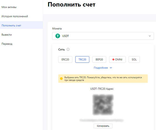 - Скопировать адрес счета для пополнения или применить QR-код для быстрого платежа.