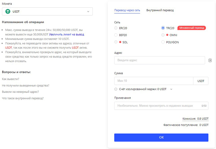 После четвертого шага отправленная транзакция поступит на обработку в выбранном блокчейне. Сроки подтверждения криптовалютных переводов зависят от цифровых сетей. Например, обработка транзакций в блокчейне Bitcoin занимает 20 минут. После подтверждения отправленного перевода в сети биржа зачислит средства на торговый счет.