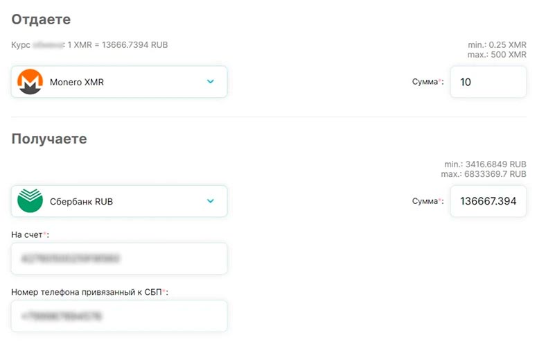 Комиссии по другим направлениям приближены к биржевым. Так, XMR можно продать за 13,626 RUB с выводом на карту СберБанка. Средний биржевой курс монеты равен 13,767 RUB. Комиссия сервиса — 1,02%.