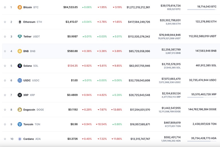 Сегодня главная цифровая монета снизилась до $65,4 тыс., а в течение дня торговалась и вовсе по $64,4 тыс. Это стало минимальным значением за июнь текущего года. Стоимость монеты за сутки снизилась на 1%. Нисходящая тенденция также наблюдается у эфириума и других крупнейших цифровых активов.