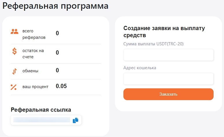 В аккаунте есть вкладка «Реферальная программа». В ней находятся пригласительная ссылка, статистика посещений и заработка. Там же расположена форма для вывода вознаграждений. Минимальная сумма выплаты — ₽3 тыс. Деньги можно отправить на криптокошелек в стейблкоине USDT сети TRC-20.