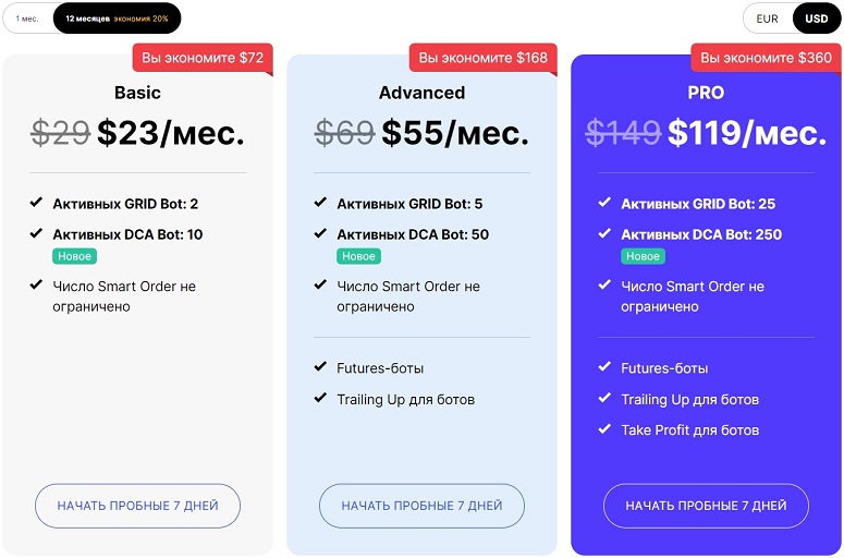 Bitsgap предлагает 3 платные подписки, которые могут быть оплачены ежемесячно или ежегодно. Каждый тариф включает в себя 7-дневную пробную версию. Для ее активации не требуется вводить данные банковской карты. Достаточно зарегистрироваться на сайте.