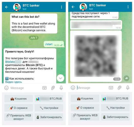 Пополнить и вывести средства со счета легко и через Телеграм-бот. Для этого нужно кликнуть на кнопку «Кошелек» в основном меню и выбрать тип транзакции. Бот сгенерирует адрес перевода и QR-код.
