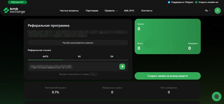 Базовая процентная ставка — 0,1% от суммы каждого обмена. Заработок начисляется на внутренний счет, откуда его можно вывести по своим реквизитам. Статистика по доходу доступна в разделе «Реферальная программа» в личном кабинете. Там же находится ссылка для привлечения новых пользователей.