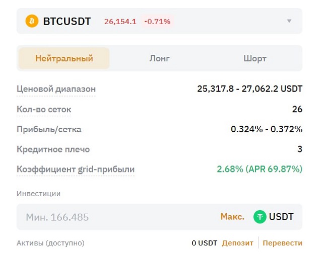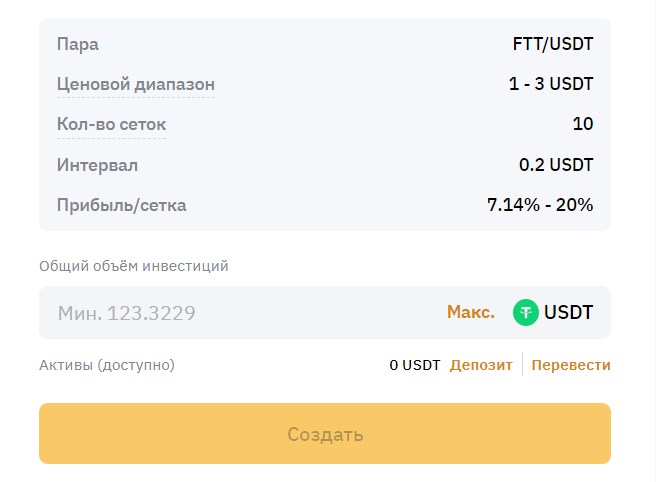 - Требуется выбрать инструмент и диапазон торговли. Например, при текущей цене ETHUSDT в $1500 алгоритм предложит коридор $1100-1900. Его можно изменить.