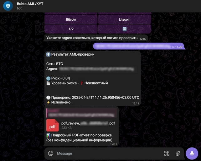 - «AML-бот телеграм» — ссылка на приложение для проверки криптовалютных транзакций и кошельков.