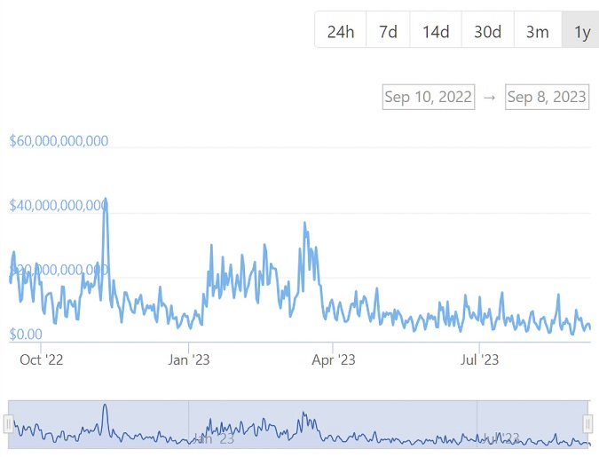 Однако объем торгов планомерно снижается в течение последнего года. На споте они сократились с $19 млрд (усредненное значение в октябре 2022-го) до $4 млрд (сентябрь 2023-го). Исторических данных по обороту деривативов не публикуется.