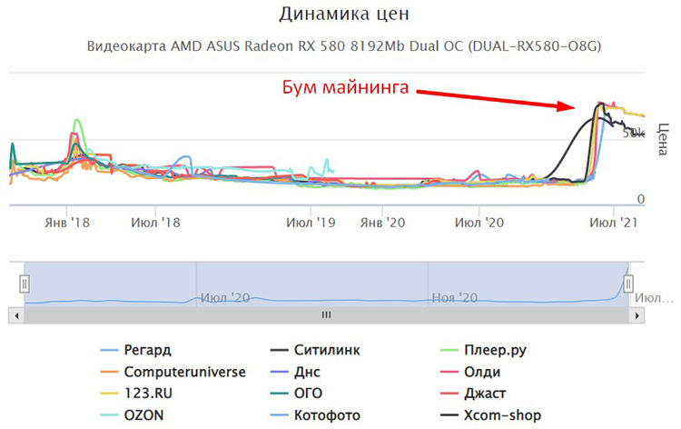 До бума добычи криптовалют цены на GPU были низкими. Когда популярность майнинга начала расти, стала увеличиваться и стоимость графических процессоров. Часть производителей повысила цену на 250% и выше. Например, купить Radeon RX 580 в 2020 году можно было за ₽18 470, но в 2021-м ее стоимость увеличилась до ₽69 460 в среднем.