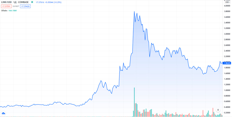 Другим поводом для роста стоимости до $2,24 стало сообщение о том, что монета проекта попала в листинг американской биржи Coinbase. А с 28 июня начался памп. За сутки цена достигла $4,45, так как накануне покупалось множество LINK, которые позже перевели на биржу Бинанс через подставные адреса.