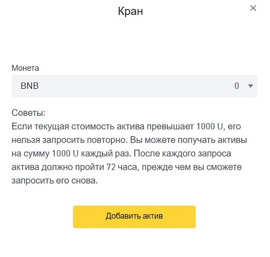 Можно запросить криптовалюту, текущий баланс которой менее 1000 USDT в эквиваленте. Заявки выполняются 1 раз в 72 часа для каждой монеты.