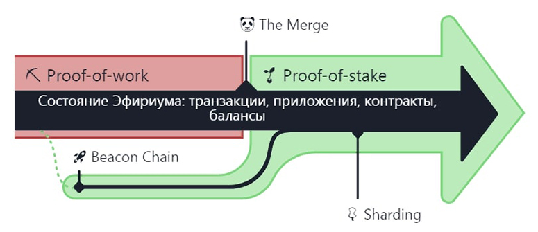 У новичков может сложиться впечатление, что Ethereum перестал функционировать и был заменен версией 2.0. Чтобы избежать недоразумений, разработчики переименовали обновление по названию фазы — The Merge. Это отражает суть изменений — слияние тестовой и основной сетей.