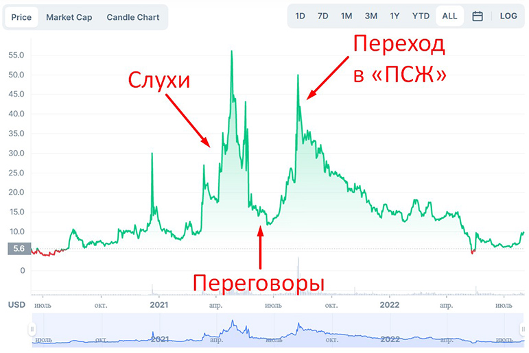 В 2021 году появилась информация о переходе футболиста Лионеля Месси в PSG. В этот период курс фан-токенов клуба начал расти и достиг $56,04. После этого футболист заявил о желании продлить контракт с Barcelona, завязались переговоры. Курс криптотокенов PSG упал до $11,68. Договориться не удалось, Месси окончательно перешел в «ПСЖ». В результате цена клубных активов достигла $49,9.