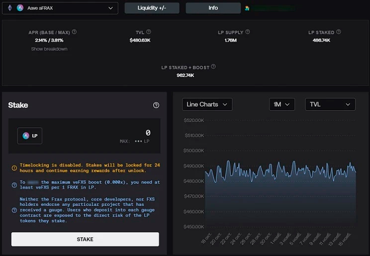 Участники экосистемы блокируют активы и получают пассивный доход. Стейкинг осуществляется с помощью смарт-контракта Gauge. Он принимает различные формы депозитов. Пользователи могут внести aFRAX в Aave, cFRAX в Compound, fFRAX во Fraxlend, токены LP и даже NFT (позиции Uniswap v3).