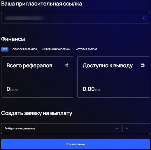 Чтобы вывести средства, нужно зайти в раздел «Реферальная программа» личного кабинета и создать заявку. Для выплаты доступны цифровые активы, платежные системы, карты Visa и Mastercard.