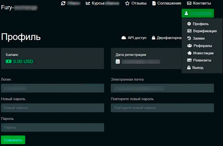 Личный кабинет официального сайта обменника Fury Exchange предлагает удобный интерфейс с простыми и понятными функциями. На странице учетной записи есть такие разделы: