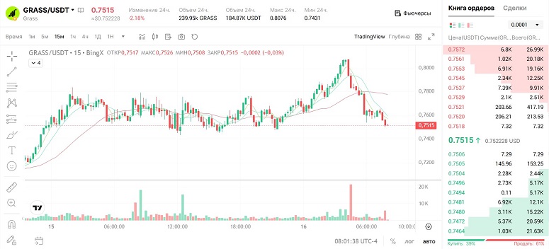 Грасс демонстрирует высокую волатильность, предлагая трейдерам много возможностей для быстрого заработка. В частности, монета подходит для торговли внутри дня (скальпинга), позволяя фиксировать прибыль от небольших движений курса. Ценовой диапазон за 24 часа составляет в среднем 7-10%. В течение недели волатильность достигает 18-20%.