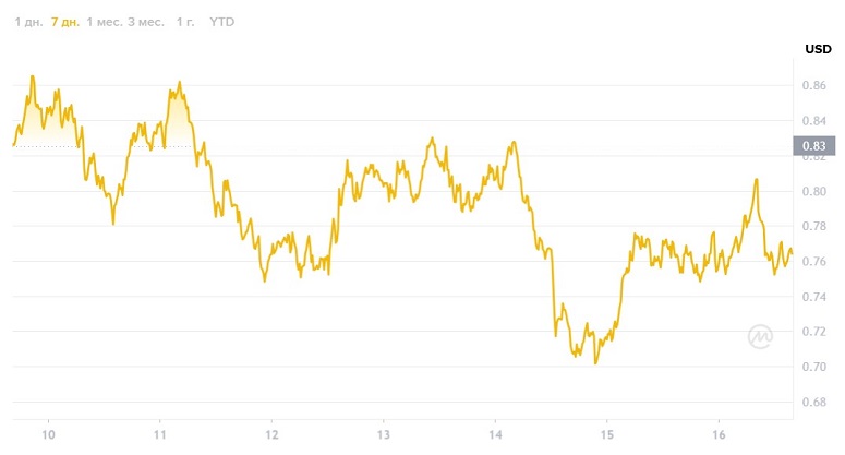 На момент подготовки обзора крипта Grass торговалась за $0,769. Неделей ранее цена достигла исторического минимума на уровне $0,646 и, оттолкнувшись от него, смогла незначительно восстановиться. Сейчас монета находится выше трендовой линии, однако по-прежнему торгуется в нисходящем канале.