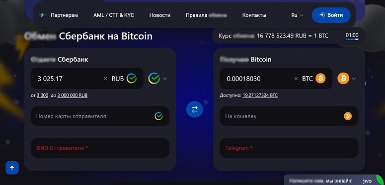 | На перевод средств по реквизитам платформы пользователю по умолчанию дают 60 минут. Если за это время деньги от клиента не поступают, сервис вправе отклонить операцию. Однако обмен можно будет возобновить, обратившись в службу поддержки. | |