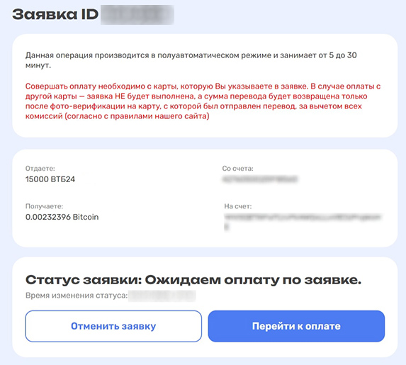 - На следующей странице нужно дополнить заявку, указав реквизиты. При оплате фиатными деньгами необходимо ввести номер карты. При покупке криптовалюты стоит указать реквизиты кошелька.