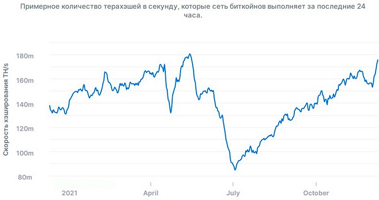 Успешность майнинга определяется числом попыток, которые предпринимают компьютеры для поиска хэша. Такие усилия совершаются непрерывно, поэтому мощность добычи измеряется в количестве хэшей в секунду (H/s). Хешрейт сети биткоина напрямую зависит от числа работающих в ней майнеров. Чем больше устройств добывают монеты, тем быстрее увеличивается сложность расчетов.