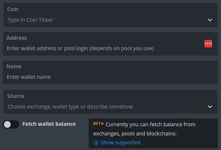 - Выбрать монету, указать адрес кошелька (или пула), его название и источник — биржу.