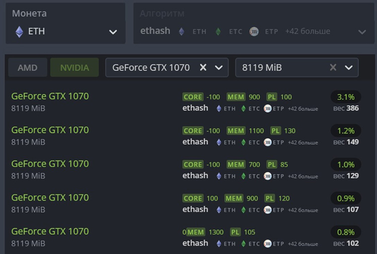 Еще майнинговая платформа предлагает популярные конфиги других пользователей. Они находятся во вкладке Popular Presets. Достаточно выбрать подходящий пресет и установить его для своих графических адаптеров.