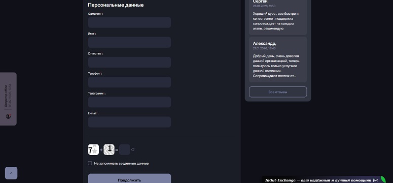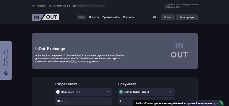 Платформа работает с весны 2025 года. Жалобы на мошенничество с ее стороны в Сети отсутствуют. Отзывы об обменнике In Out Exchange выкладываются на независимых ресурсах. Ссылки на них администрация сервиса публикует у себя на сайте.