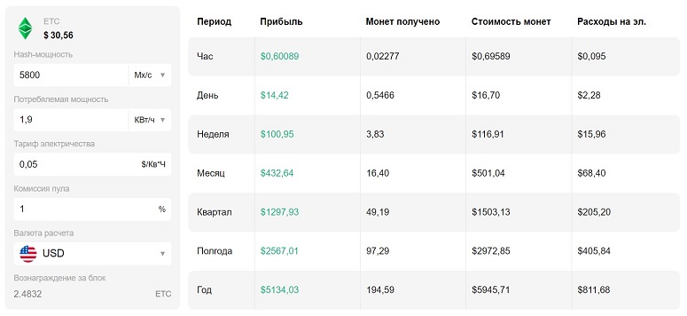 Программа выдаст результат в виде таблицы. Показатели доходности будут рассчитаны за периоды — час, день, неделю, месяц, квартал, полгода, год. Для удобства пользователей указывается чистая прибыль, количество и стоимость добытых монет. В отдельной графе подсчитаны расходы на электричество за период.