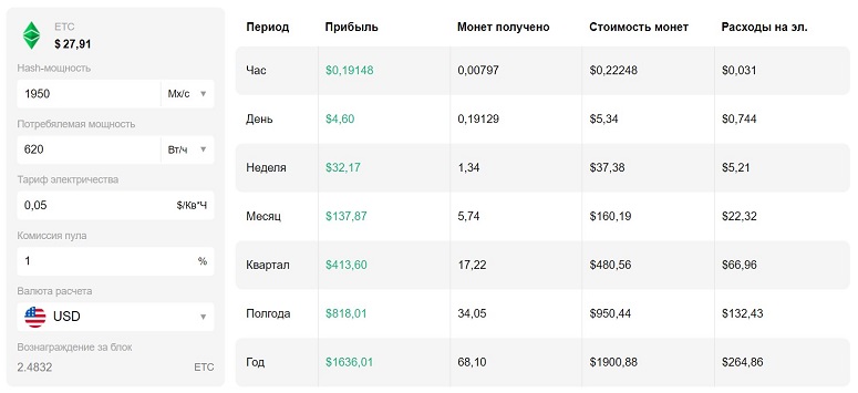 Перед запуском майнинга нужно рассчитать потенциальную доходность по монетам. Для этого используют онлайн-калькуляторы. Например, дуал-майнинг ETC+ZIL в апреле 2024 года приносит $6,09 ($4,6 + $1,49). В расчете учтена стоимость электричества $0,05 и комиссия пула 1%.