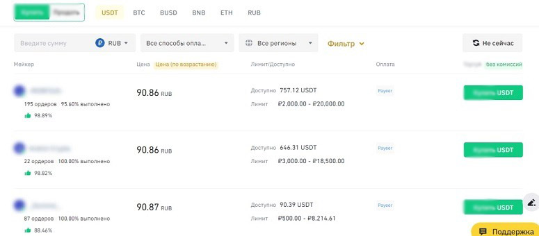 На пиринговой платформе Бинанс пользователи совершают сделки напрямую без посредников. Поэтому можно купить ЮСДТ на Binance через P2P с минимальной комиссией — 0,5-1%. Благодаря высокой ликвидности на рынке всегда доступны выгодные предложения. Минимальная сумма сделки — 500 рублей, максимальная — 3 млн руб.
