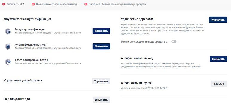 Перед переводом активов на Коммекс необходимо настроить защиту аккаунта. Рекомендуется включить двухфакторную аутентификацию, антифишинговый код и создать белый список IP для вывода денег.