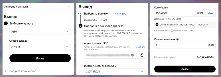 Для внешних выводов действуют минимальные суммы и индивидуальные лимиты по каждому активу. Эти параметры могут меняться и для одной цифровой валюты при переводах в различных сетях.