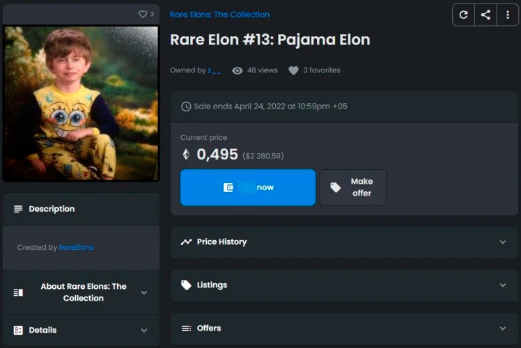 Часть криптосообщества видит в рынке NFT возможность заработать. Один из простых способов сделать это — продавать старые или новые мемы. К примеру, неизвестный художник создал коллекцию Rare Elons. Он грамотно изменил лица людей из популярных мемов и фотографий под внешность Илона Маска. По состоянию на декабрь 2021 года стоимость каждого NFT-токена — от $100 до $17 тыс.