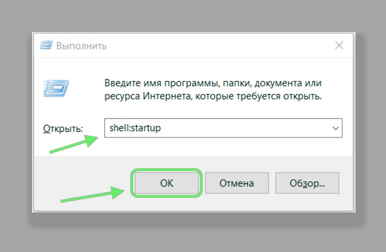 - Ввести команду shell:startup и нажать на кнопку ОК.