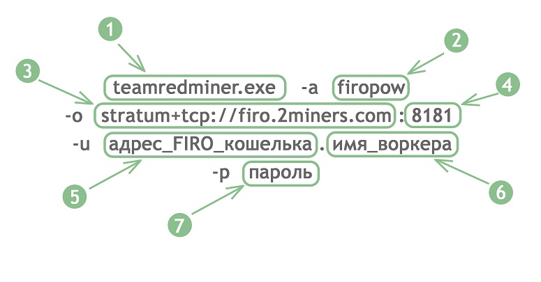 | Название_майнера -a firopow -o stratum+tcp://firo.2miners.com:8181 -u адрес_FIRO_кошелька.имя_воркера -p 1234 |