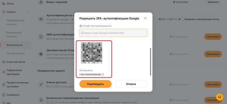 Для восстановления потребуется ввести специальный ключ, который представлен QR-кодом или комбинацией символов. Он отображается только раз, когда учетная запись на бирже привязывается к Google Authenticator. Торговая площадка не хранит код, поэтому его необходимо записать и поместить в надежное место.