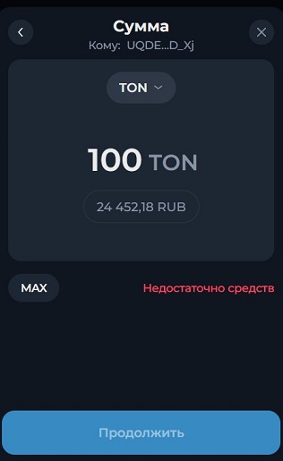 - Сначала нужно ввести цифровой адрес получателя. Нажать на кнопку «Продолжить».