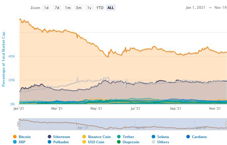 По данным Cryptoru.com, в ноябре 2021 года на цифровом рынке представлены 14443 криптомонеты. Но далеко не все могут похвастаться работающими экосистемами. По информации ресурса CoinMarketCap, с начала 2021 года рыночная альткоинов увеличилась на 86% (с $226,85 млрд в январе до $1,62 трлн в ноябре). Индекс доминирования биткоина за тот же период упал на 26,1% (с 69,7% до 43,5%). Причина не только в том, что BTC уже исчерпал годовой потенциал роста после подорожания на 300%. Одним из драйверов изменений эксперты называют возрастающую роль активов первого эшелона: Ethereum, Litecoin, Polkadot, Monero, XRP и других.