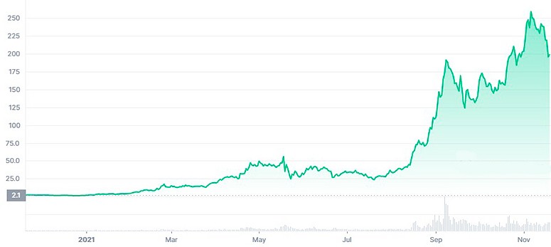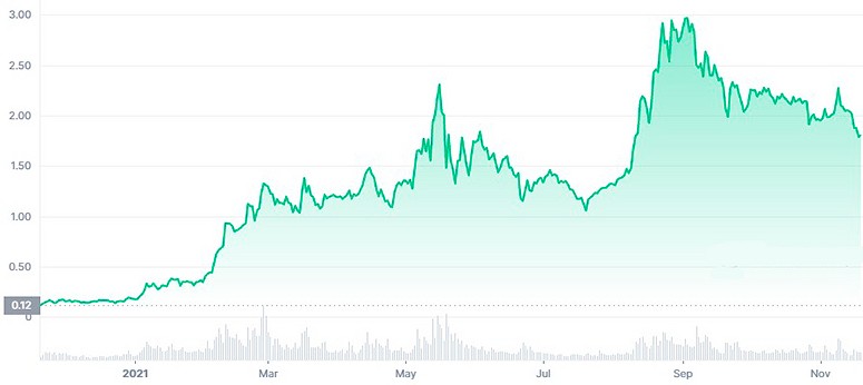 Проект сотрудничает с известными операторами Brave New Coin, Huobi. Chainlink поставляет данные для сервисов DeFi (Compoud, Aave). Частные инвесторы могут получать доход, участвуя в работе сети в качестве нодов, или зарабатывать на росте курса актива. За 2021 год криптовалюта подорожала в 2 раза. В ноябре монета торгуется на уровне $26,74. В январе она стоила $12,29.