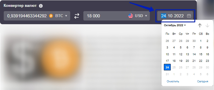 Кроме того, калькулятор для перевода BTC в рубли показывает исторический курс. Для этого необходимо нажать на иконку календаря. После выбора даты стоимость будет пересчитана.