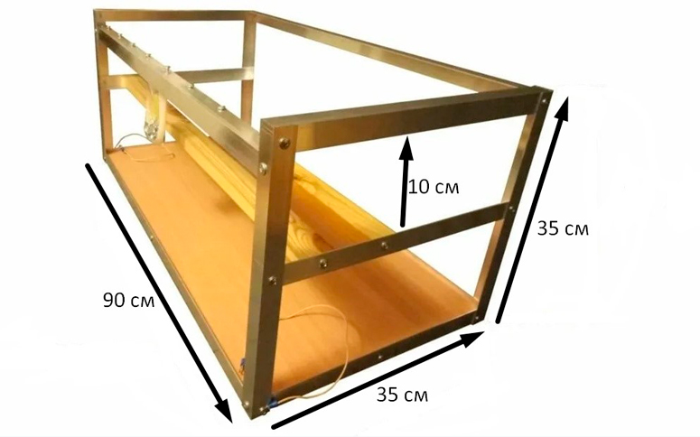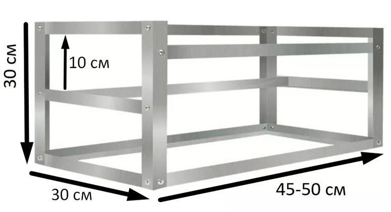 Система из шести GPU требует больших капиталовложений, но окупится она быстрее в среднем на 10-15%, в зависимости от биржевой стоимости криптовалюты. Чертеж каркаса для фермы майнинга на 6 карт необходимо подбирать с учетом размера видеочипов, блоков питания и материнских плат. Можно использовать как дерево, так и алюминиевый профиль. Размеры для примера: