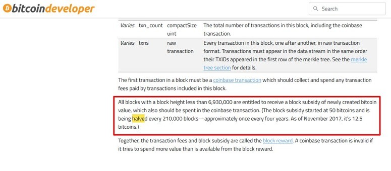 Bitcoin — первый актив, предложение которого ограничено. Ежегодно может добываться только определенное количество коинов до тех пор, пока не будет выпущен в общей сложности 21 миллион монет. Дефицит регулируется алгоритмом в исходном коде биткоина, и его может проверить любой участник сети. За создание блоков узлы получают вознаграждение, которое помогает покрывать затраты на добычу монет. Каждые четыре года алгоритм сокращает плату вдвое. Этот процесс называется . Примерно в 2140 году будет добыт последний биткоин.